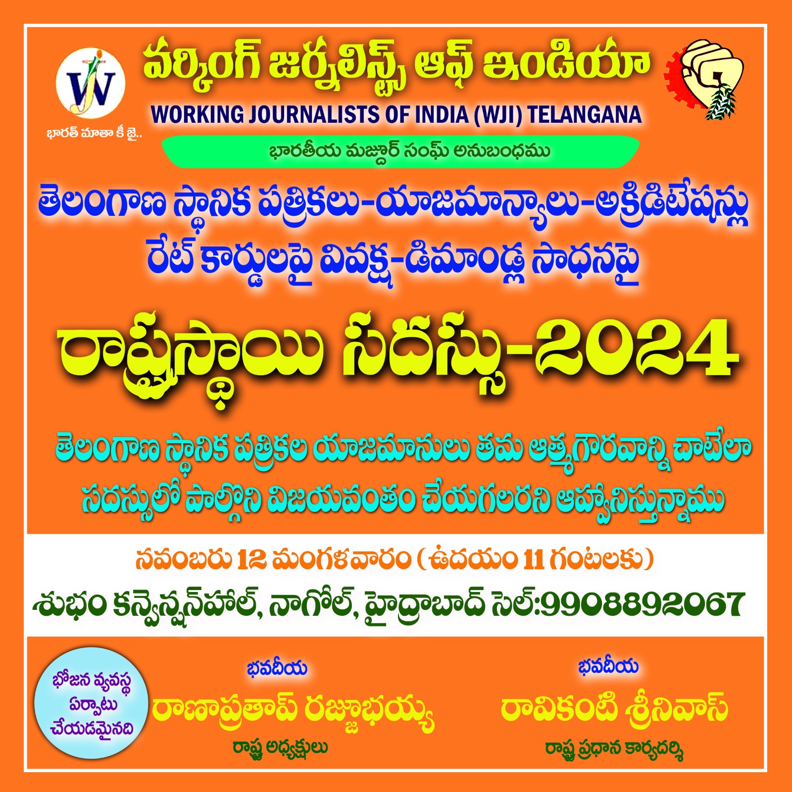 WJI Telangana (Working Journalists of India, Telangana Chapter) is a professional organization dedicated to uniting, supporting, and empowering journalists across print, electronic, and digital media in the Telangana region. Committed to the principles of truth, transparency, and accountability, the organization works tirelessly to protect journalist rights, promote ethical journalism, and advocate for press freedom. Through various initiatives including press meets, training workshops, awareness campaigns, and welfare programs, WJI Telangana provides a strong support system for media professionals while fostering a united community that contributes to a fair and informed society. Led by a dedicated team of experienced journalists including President Rana Pratap, Hon'ble President Nandanam Krupakar, General Secretary Ravikanti Srinivas, and Advisor G. Valleeswar, the organization serves as a collective voice for journalists, ensuring their rights are protected and their contributions to democracy are recognized and valued.